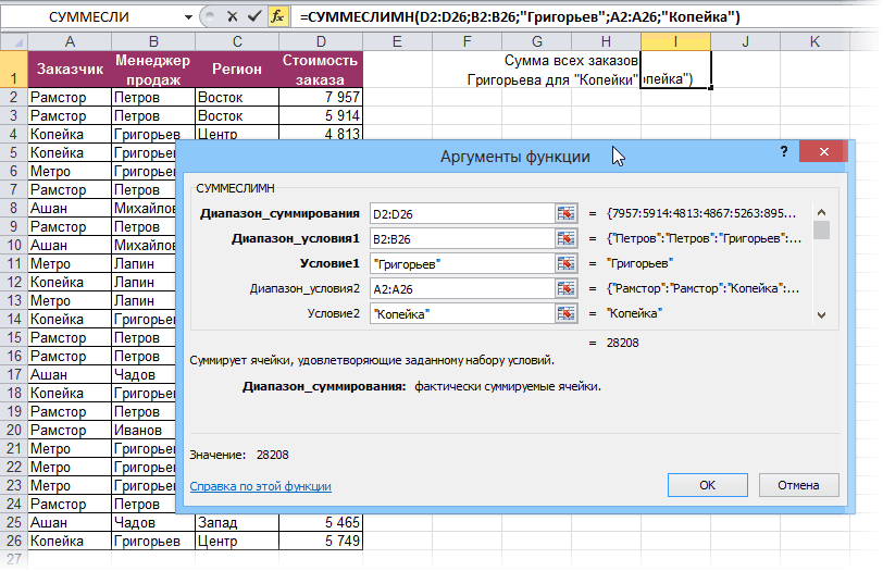 При первой записи у вас могут возникнуть трудности с правильным написанием функции, ведь она содержит много условий. Я оставлю вам ее отдельно, чтобы вы могли скопировать ее и вставить, подставив вместо текущих диапазонов ячеек свои: =СУММЕСЛИМН(B2:B25;A2:A25;»Груши»;C2:C25;»>10″). Не забывайте о том, что первый диапазон – то, что вы считаете, далее идет первый критерий – диапазон с названием столбца, потом второй – диапазон с неравенством.
