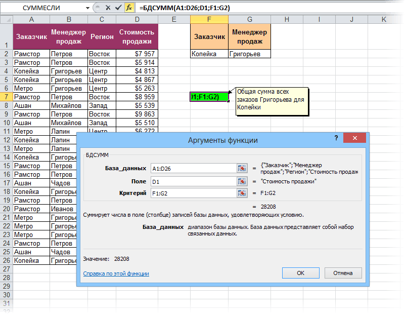 Например, для суммирования продаж винограда (H1) в Северном регионе (H2) используется следующая формула: