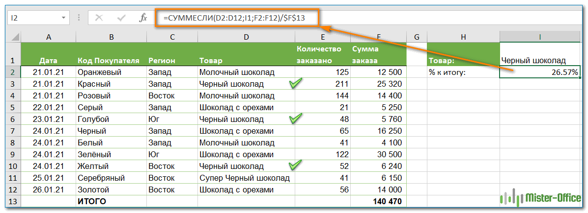 Если вы хотите узнать, какую часть общей суммы составляют несколько различных товаров, сложите результаты, возвращаемые несколькими функциями СУММЕСЛИ, а затем разделите это число на итоговую сумму. Например, по следующей формуле рассчитывается доля черного и супер черного шоколада: