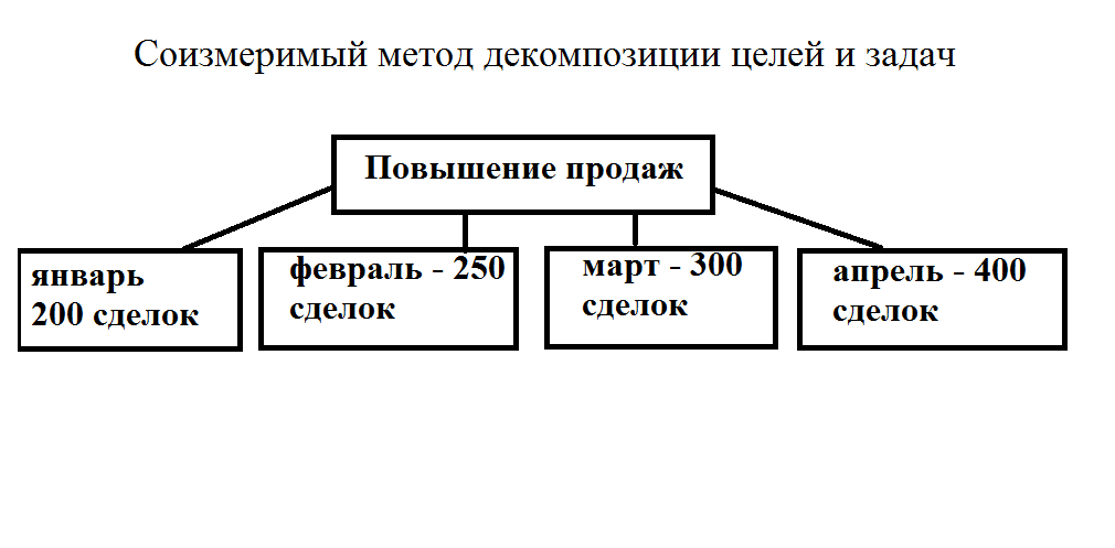 То есть, компания поставила главную цель в виде последовательного увеличения продаж. Однако сразу добиться результата невозможно, поэтому она разделила достижение задачи на этапы по числу заключаемых сделок в каждом месяце.