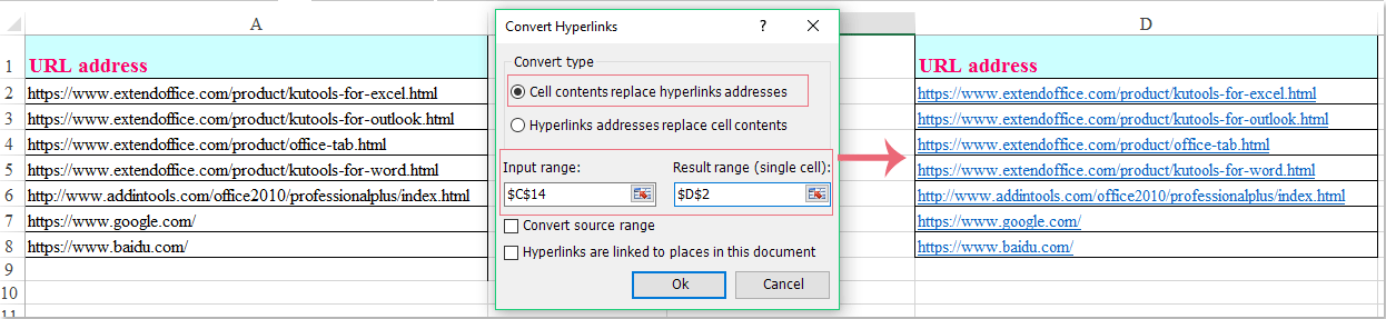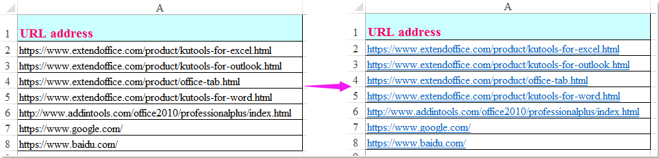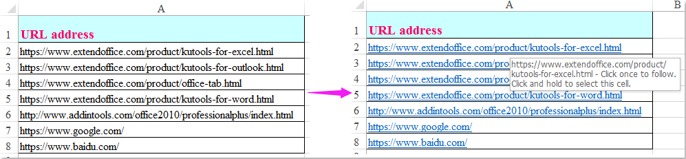 Все изменения выполняются автоматически, а далее вам остается только убедиться в том, что вместо обычного текста появились активные ссылки, переход по которым возможен (если в их содержимом действительно находится веб-адрес).