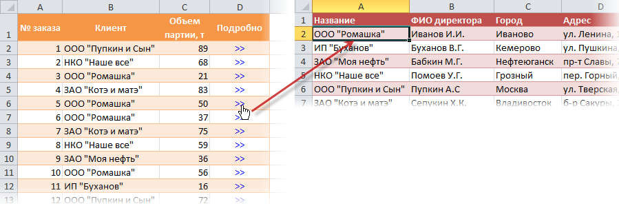 У нас есть две таблицы на разных листах одной и той же книги: таблица с заказами от клиентов (на Листе заказов) и таблица с клиентской базой (на Листе клиентов). При работе с таблицей заказов я хочу иметь возможность быстро переключаться в таблицу клиентов, чтобы видеть подробные данные о клиенте (адрес, ФИО директора и т.д.). То есть, другими словами, я хочу, чтобы в каждой строке таблицы заказов была гиперссылка, при нажатии на которую вы будете переходить на лист Заказчика, причем именно на строку, где упоминается этот клиент: