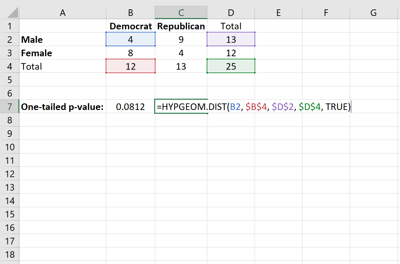 Хотя в Excel нет встроенной функции для выполнения этого теста, мы можем использовать гипергеометрическую функцию для выполнения теста, которая использует следующий синтаксис: