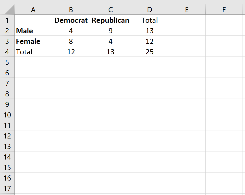 Предположим, мы хотим знать, связан ли пол с предпочтениями политической партии в конкретном колледже. Чтобы изучить это, мы случайным образом опрашиваем 25 студентов в кампусе. Количество студентов, которые являются демократами или республиканцами, в зависимости от пола, показано в таблице ниже: