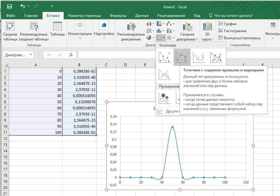 Excel построит гистограмму нормального распределения на основе выбранных данных.