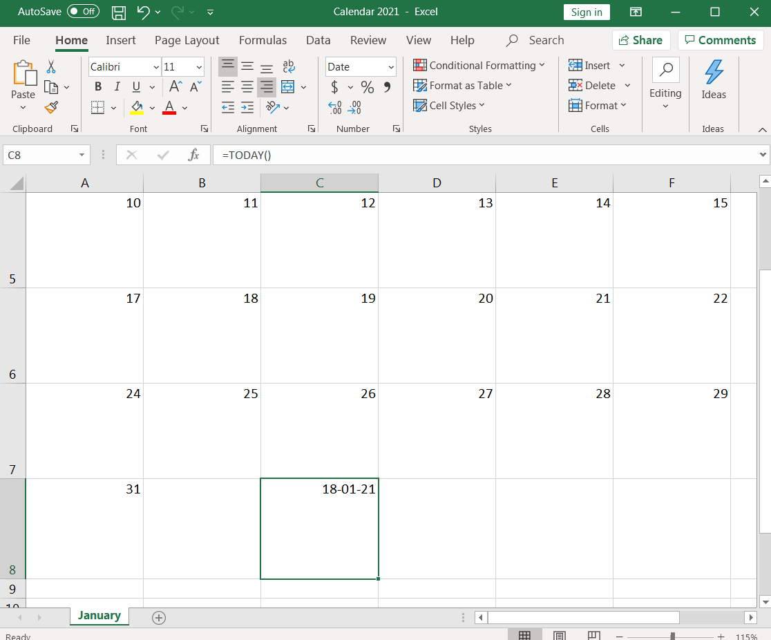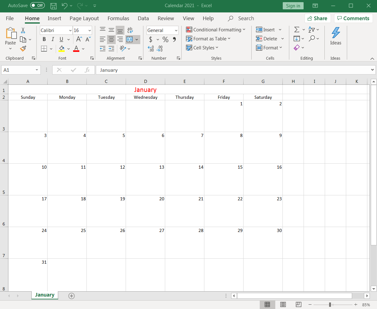 This will help you find out which day of the week your calendar should start on. In 2021, Jan 1st was a Friday, so you start numbering January from F3.