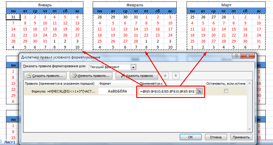 Чтобы сделать шаблон графика отпусков более удобным для чтения и визуального анализа добавим правило условного форматирования: