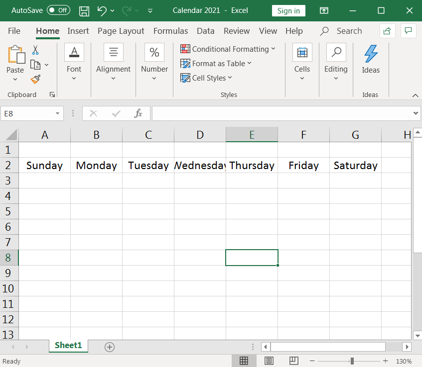 Select six rows (3-8) under the ‘days of the week’ row and adjust the first row’s height to your desired size. All six rows will again automatically take the same height.