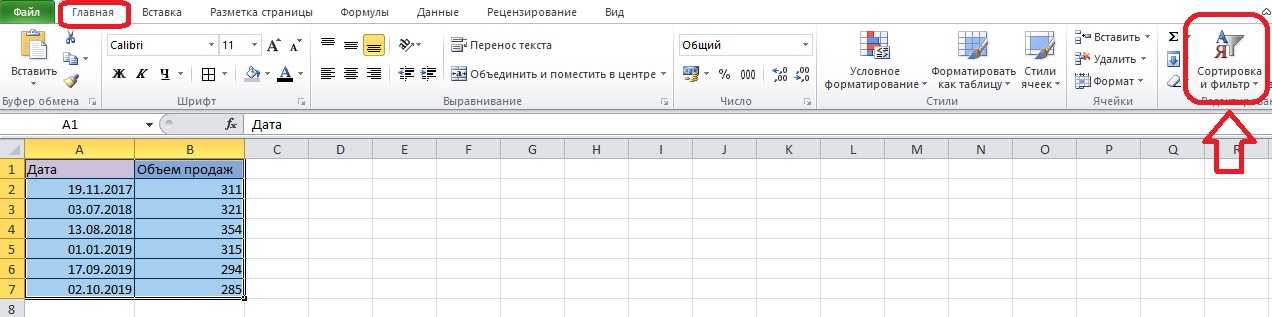 - Выбираем одну из заполненных ячеек и переходим на вкладку «Главная». Справа вверху появится кнопка «Сортировка и фильтр» – нажмите ее, чтобы открыть меню.
