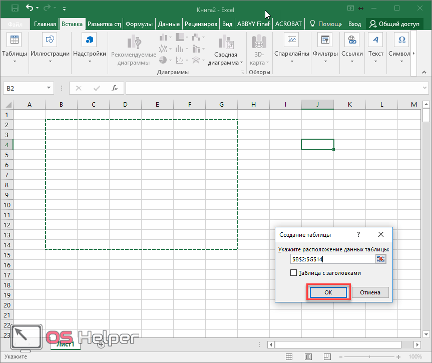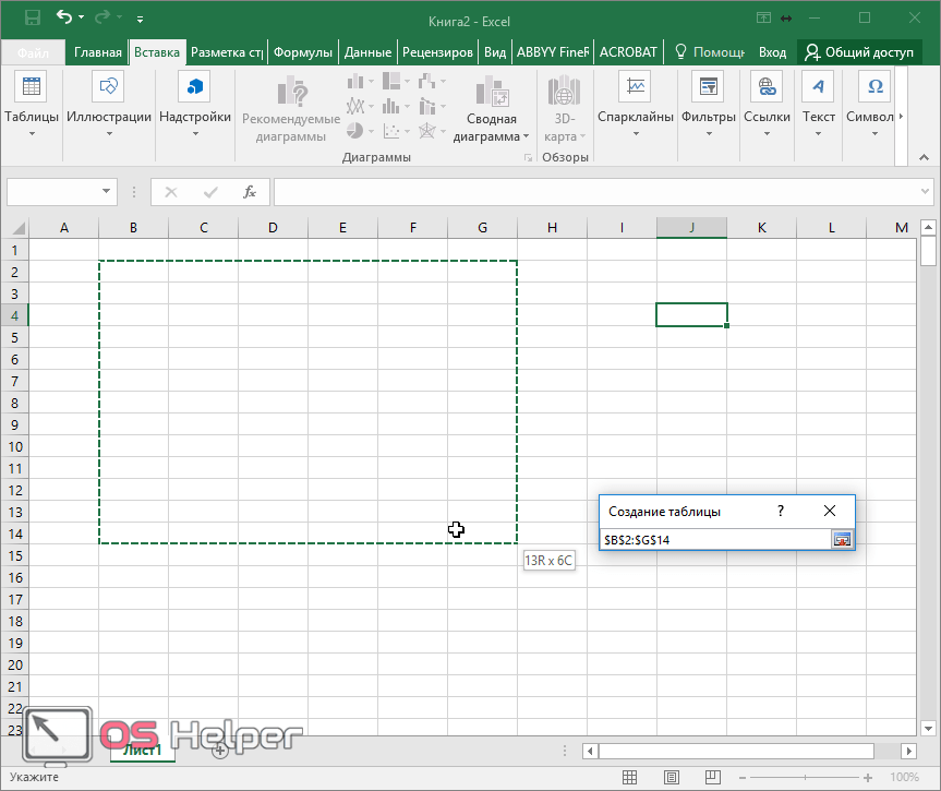 - Сразу после этого у вас появится окно, в котором нужно указать диапазон будущей таблицы.