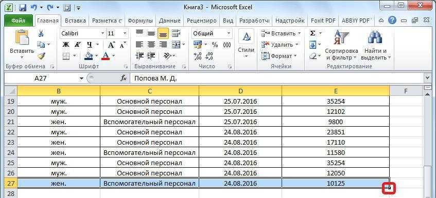 - Для начала мы выделяем всю последнюю строку таблицы, щелкнув левой кнопкой мыши по ее номеру. Затем наводим курсор на нижний правый угол строки, пока он не изменит свою форму на “крестик”.