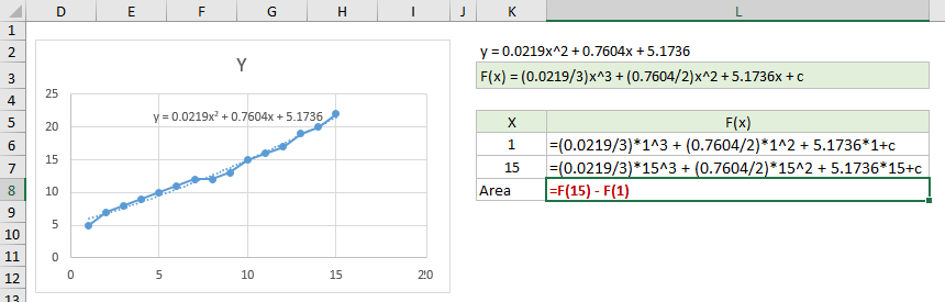 В моем случае общее уравнение по линии тренда: у = 0.0219x ^ 2 + 0.7604x + 5.1736, поэтому его определенный интеграл равен Р (х) = (0.0219 / 3) x ^ 3 + (0.7604 / 2) x ^ 2 + 5.1736x + c.
