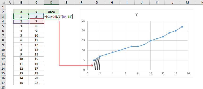 1. Первая трапеция находится между x = 1 и x = 2 под кривой, как показано на скриншоте ниже. Вы можете легко рассчитать его площадь по этой формуле: =(C3+C4)/2*(B4-B3).