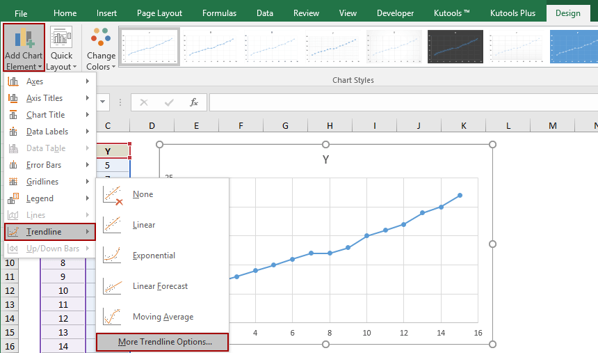 1. Выберите построенную диаграмму и нажмите Дизайн (или Дизайн диаграммы)> Добавить элемент диаграммы > Trendline > Дополнительные параметры линии тренда. Смотрите скриншот: