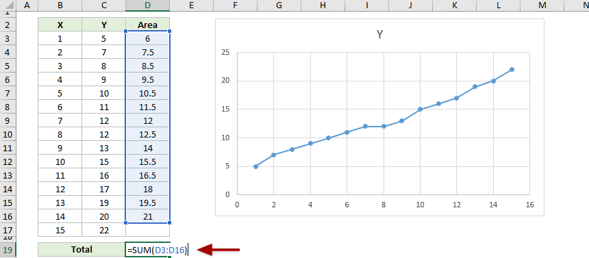 3. Теперь вычислены площади всех трапеций. Выберите пустую ячейку, введите формулу = СУММ (D3: D16) чтобы получить общую площадь под нанесенной областью.
