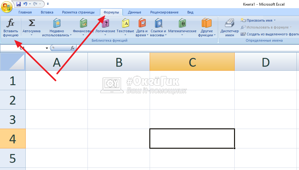 Поставьте курсор в ячейку, где вы хотите получить результат возведения числа в степень. Нажмите “Формулы” — “Вставить функцию”.
