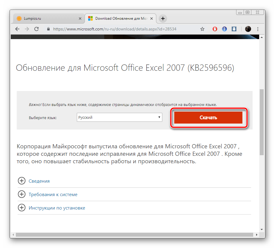 Компания Microsoft на своем официальном сайте выкладывает файлы загрузок, чтобы при необходимости пользователь мог скачать их и установить вручную. За время поддержки работы Excel 2007 было выпущено одно крупное обновление, исправляющее некоторые ошибки и оптимизирующее программу. Поставить его на ПК можно следующим образом: