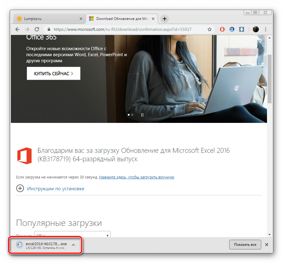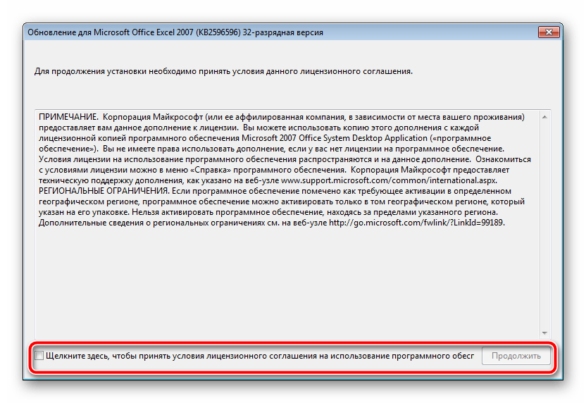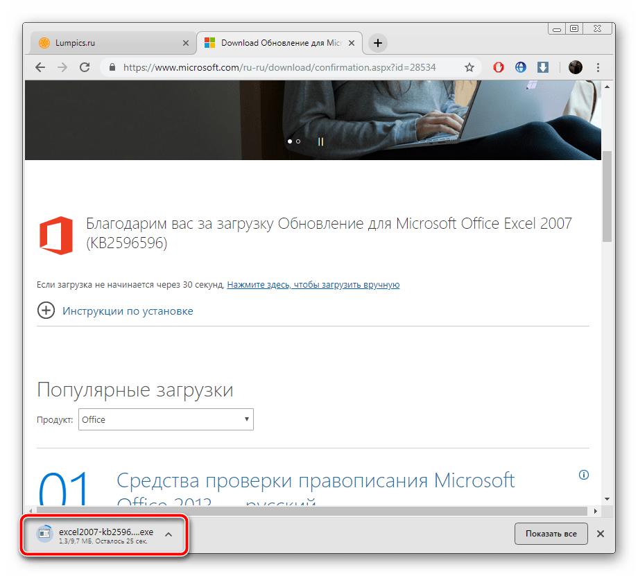 Данный метод все еще нормально функционирует в операционной системе Windows 7, но последующих версиях им пользоваться нельзя. Если же вы обладатель упомянутой выше ОС и хотите загрузить обновление к Excel 2007, сделать это можно так:
