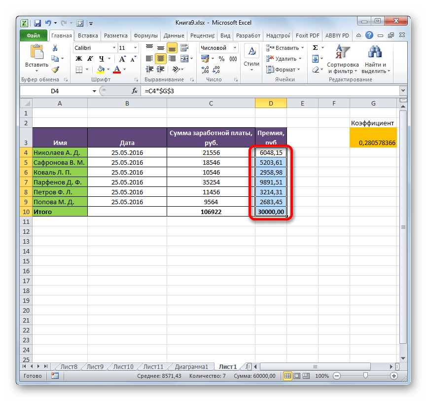 - Получаем столбец с результатами, рассчитанными по формулам.
