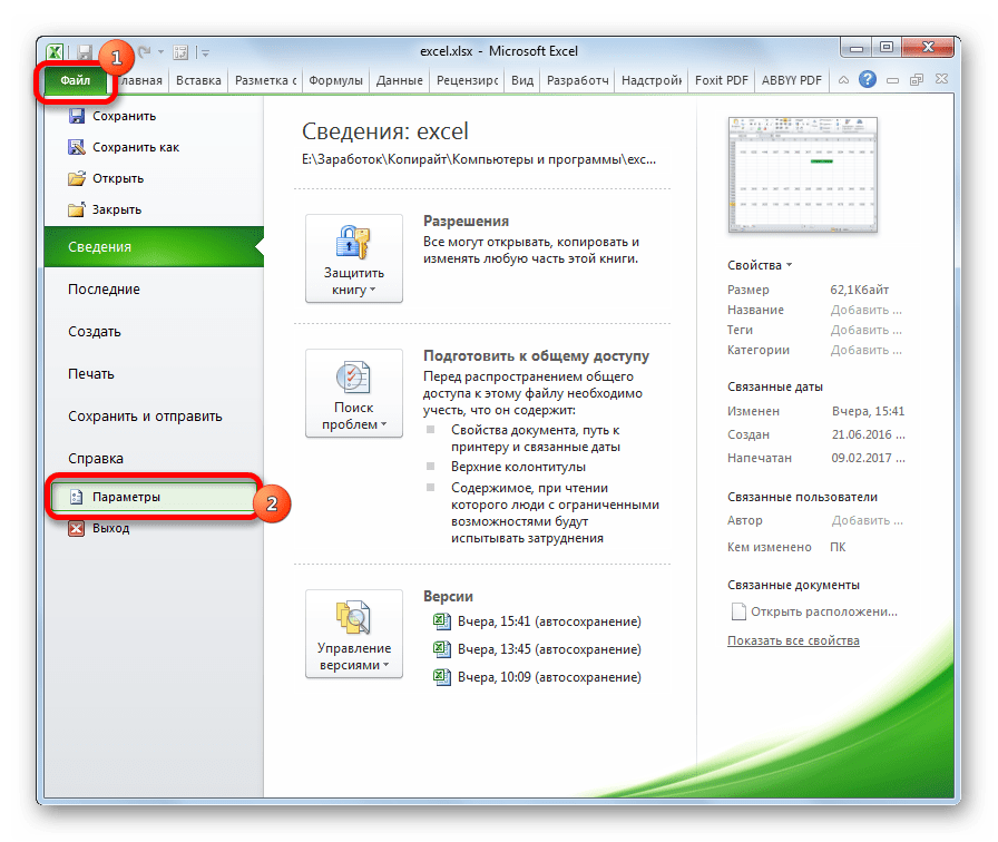 - Перейдите на вкладку «Файл». Пока вы в нем, вы должны нажать на запись «Параметры».