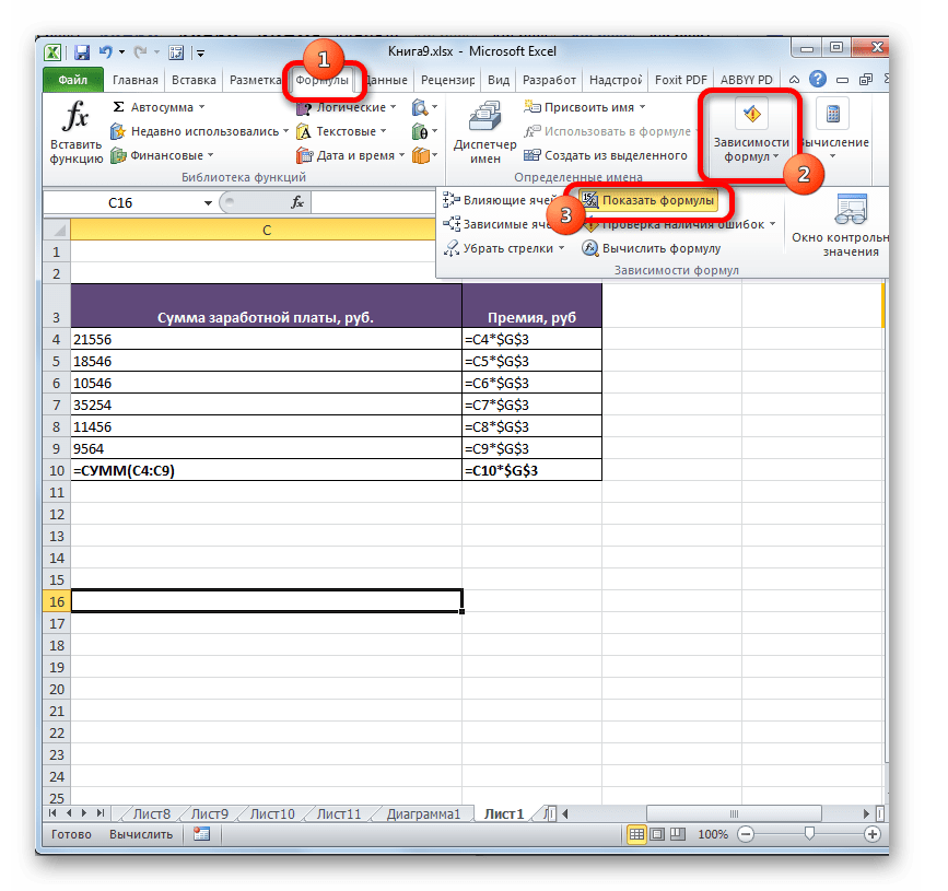 Внутри него с правой стороны будет надпись « Показать формулы кнопка