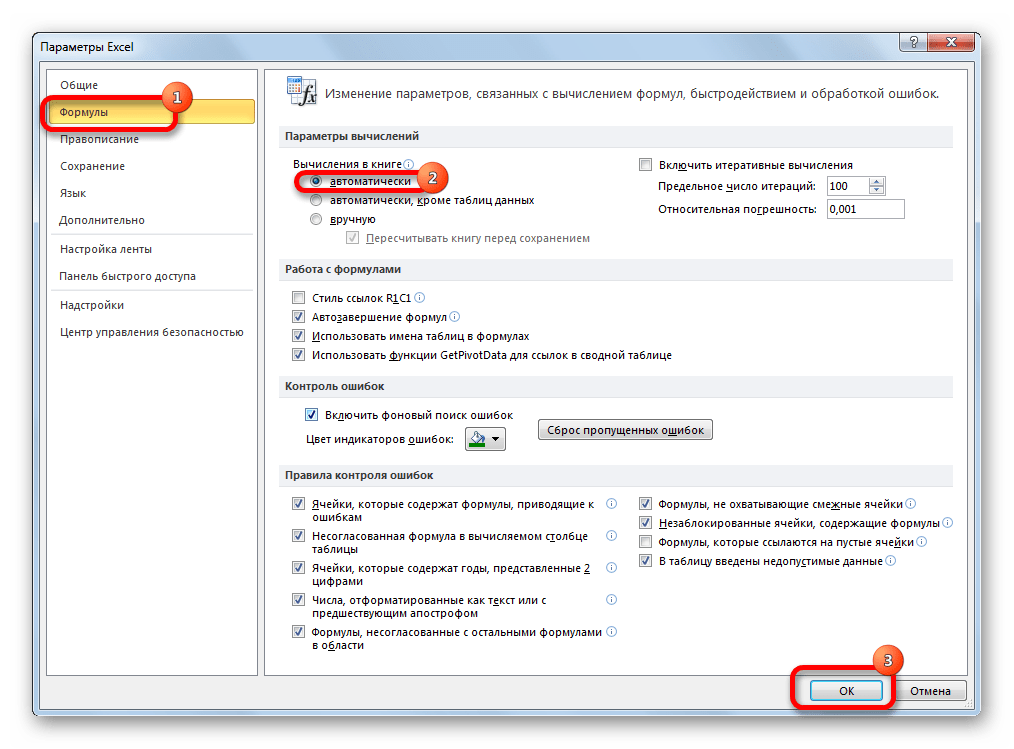 Откроется окно настроек. Вам необходимо перейти в раздел «Формулы». В блоке настроек «Параметры расчета», который находится в верхней части окна, если параметр «Расчеты в книге» не установлен в положение «Автоматически», результат расчетов не имеет значения. Переставляем переключатель в нужное положение. После завершения вышеуказанных настроек, чтобы сохранить их в нижней части окна, нажмите кнопку «ОК».