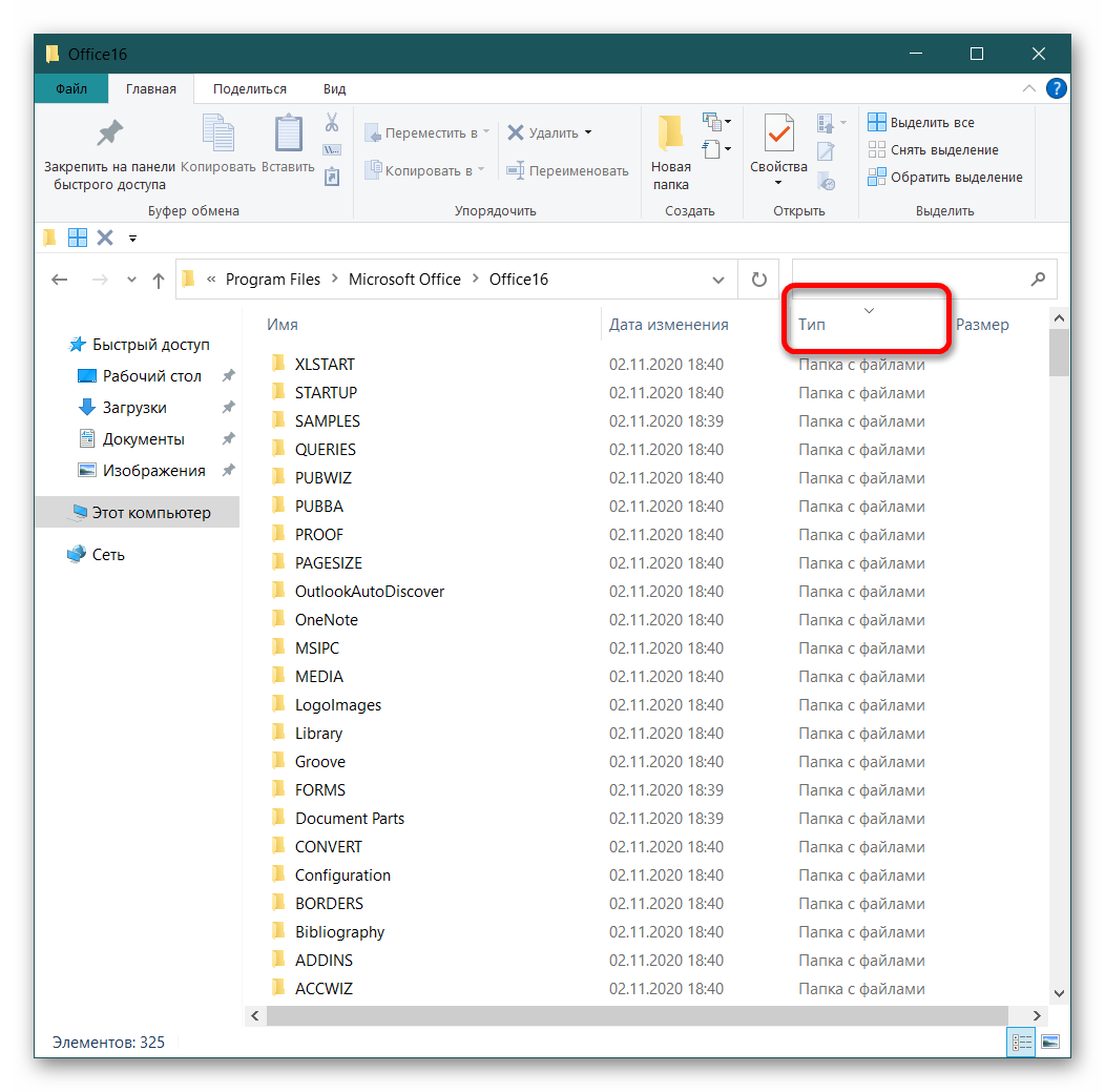 В конечной папке необходимо отсортировать объекты по типу. Для этого кликните левой кнопкой мыши (ЛКМ) по названию столбца «Тип».