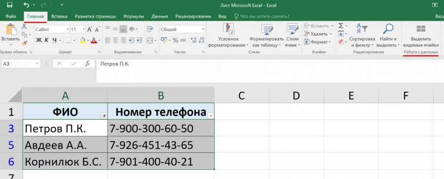 Третий шаг. В итоге в нашем примере в закладке «Главная» появился раздел «Работа с данными», в котором есть кнопка «Выделить видимые ячейки». Теперь с помощью неё можно выделять нужные ячейке после использования фильтра. Вы сначала делаете фильтр, потом выделяете отфильтрованный диапазон, а потом нажимаете на эту кнопку, чтобы программа выделила только видимые ячейки.