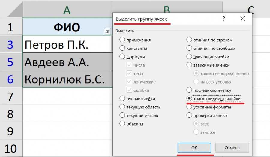 Третий шаг. На экране появится меню «Выделить группу ячеек», в котором можно найти в нижнем правом углу строку «только видимые ячейки», напротив этой строки ставим точку и закрываем данное меню.