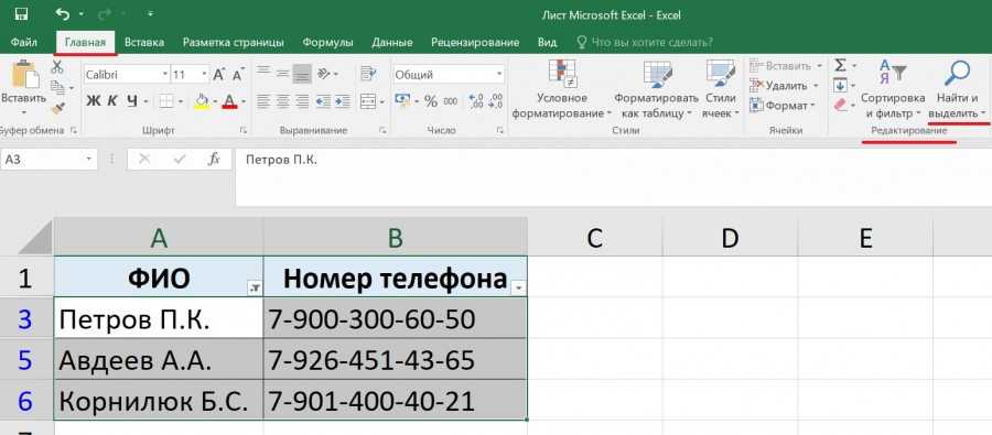 Первый шаг. Сначала выделим нужный отфильтрованный диапазон ячеек, после перейдем на верхней панели настроек в закладку «Главная», где найдем блок «Редактирование» и нажмем на иконку «Найти и выделить».