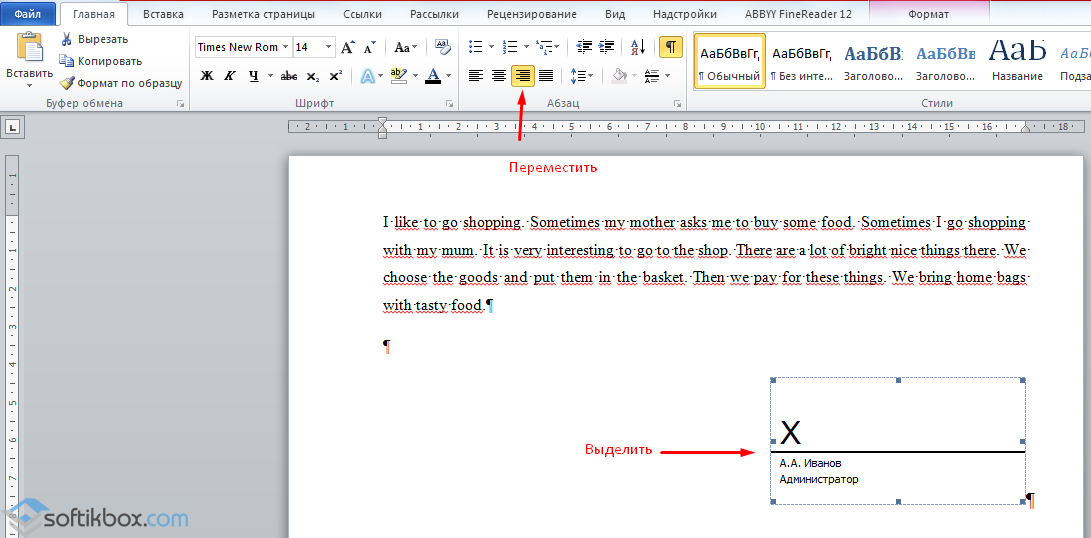 Если положение подписи вас не устраивает, выделяем область подписи и меняем положение в тексте.