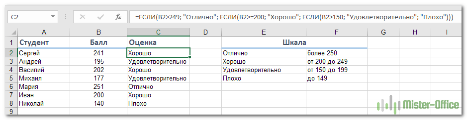 ЕСЛИ ( проверить, если B2> = 249, если ИСТИНА — вернуть «отлично», или же ЕСЛИ ( проверить, если B2> = 200, если ИСТИНА — вернуть «хорошо», или жеЕСЛИ ( проверить, если B2> 150, если ИСТИНА — вернуть «Удовлетворительно», если ЛОЖЬ -вернуть «Плохо»)))