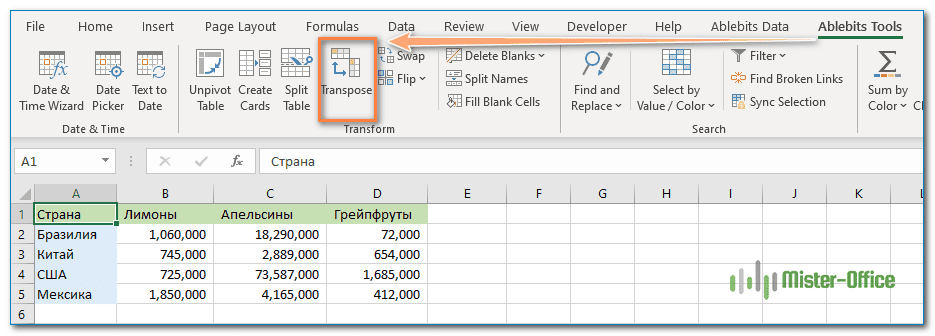 - Выделите любую отдельную ячейку в таблице, перейдите на вкладку AblebitsTools > Transform и нажмите кнопку Transpose.