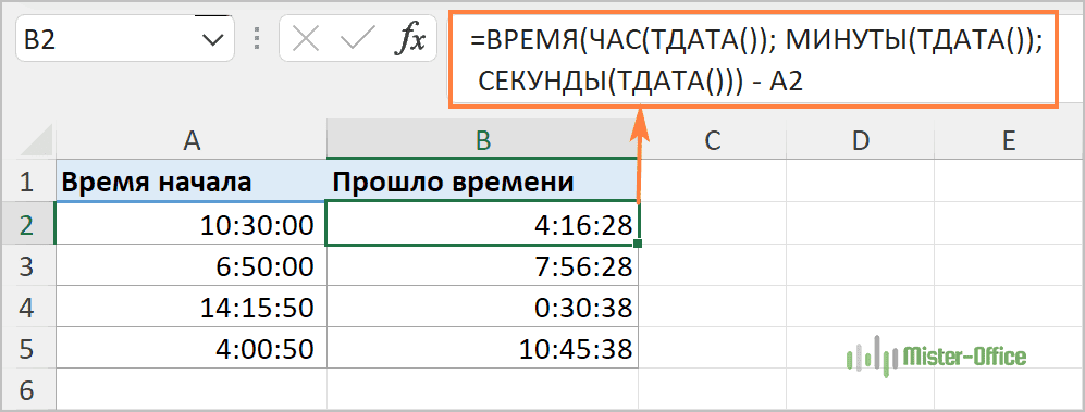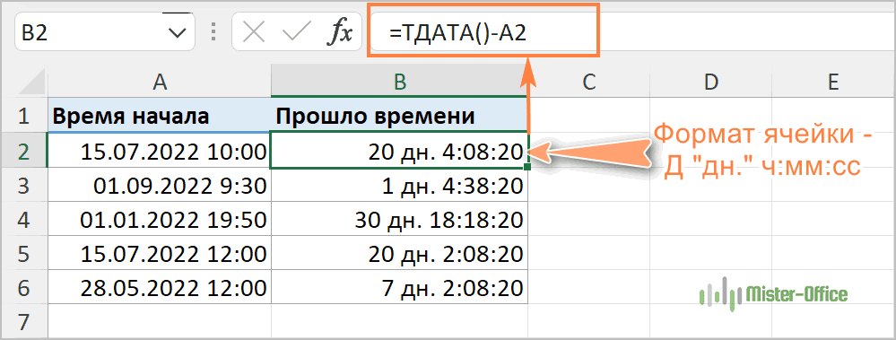 Предположим, что начальная дата и время находятся в A2, выражение =ТДАТА()-A2 возвращает следующие результаты, при условии, что вы применили соответствующий формат времени к столбцу B (в этом примере «ч:мм») :