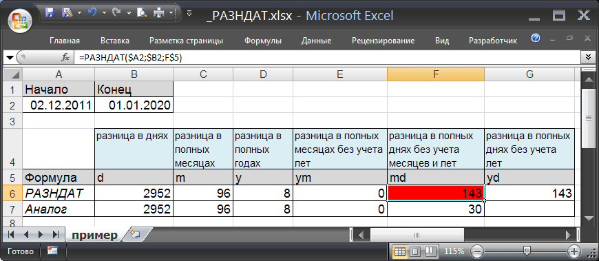 Формула =РАЗНДАТ(A2;B2;»md») вернет количество дней между двумя датами без учета месяцев и лет. Использовать функцию РАЗНДАТ() с этим аргументом не рекомендуется (см. примеры ниже).