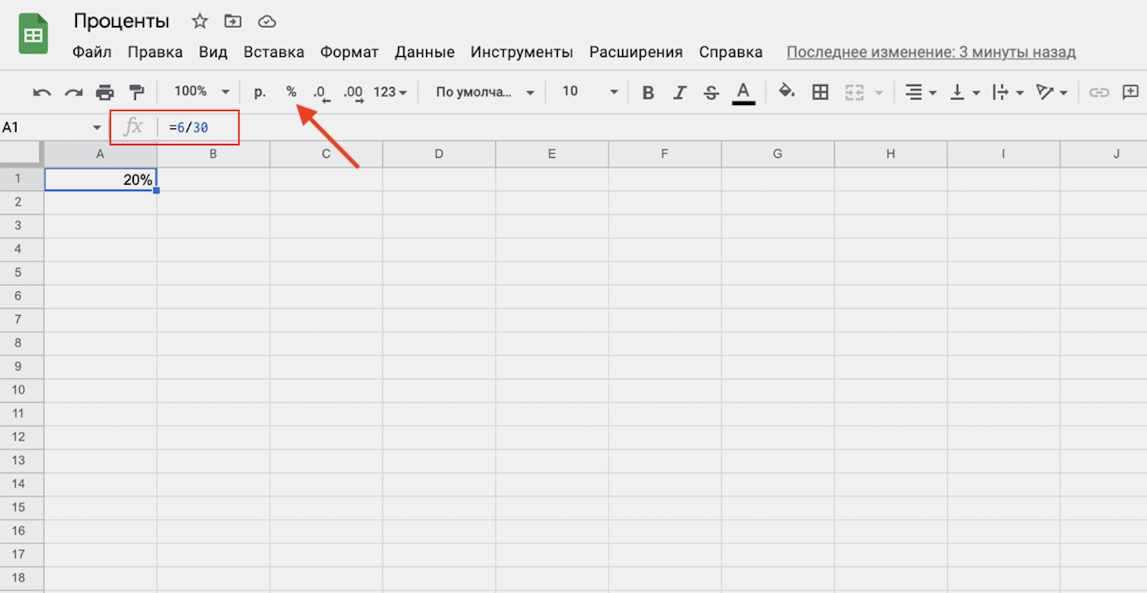 Как посчитать проценты в «Google Таблицах»? В них можно использовать все способы, описанные выше, — они работают по аналогии с Excel. При этом изменить формат ячейки с общего на процентный можно кнопкой на основной панели.