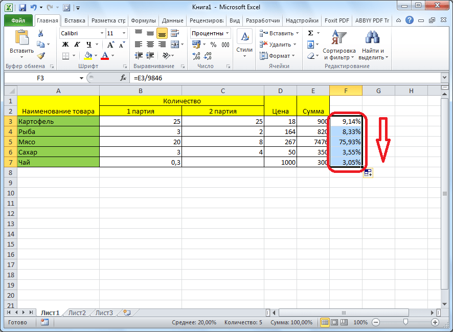 На ленте, нажмите кнопку Percent Style, чтобы отформатировать колонку в виде процентов. В результате вы должны увидеть следующее:
