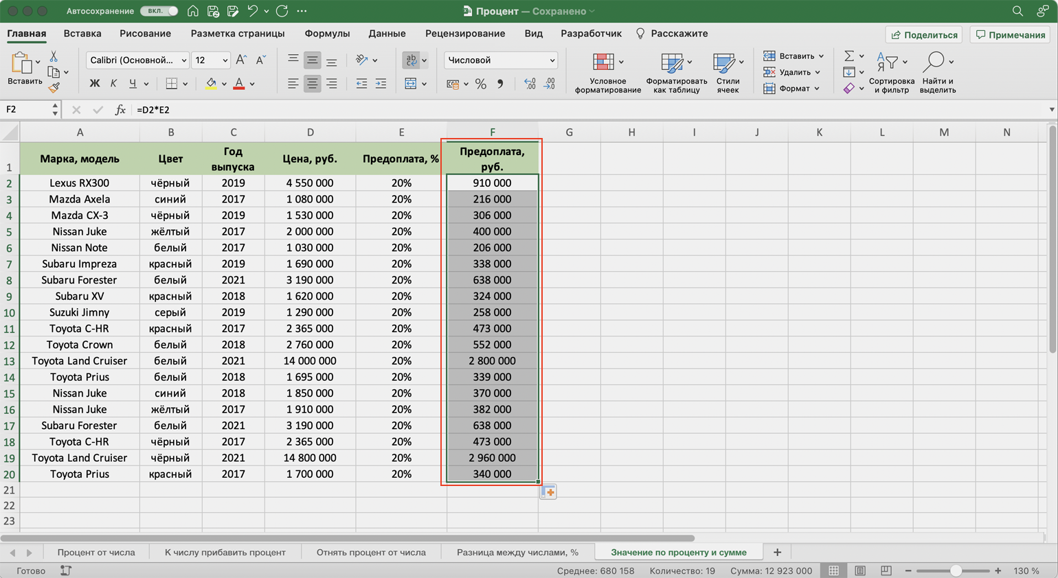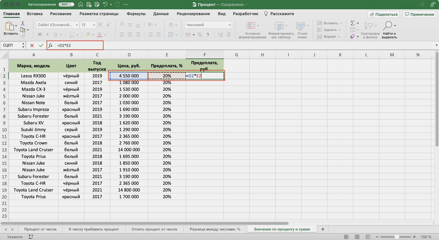 где D2 — цена автомобиля, E2 — размер предоплаты в процентах.