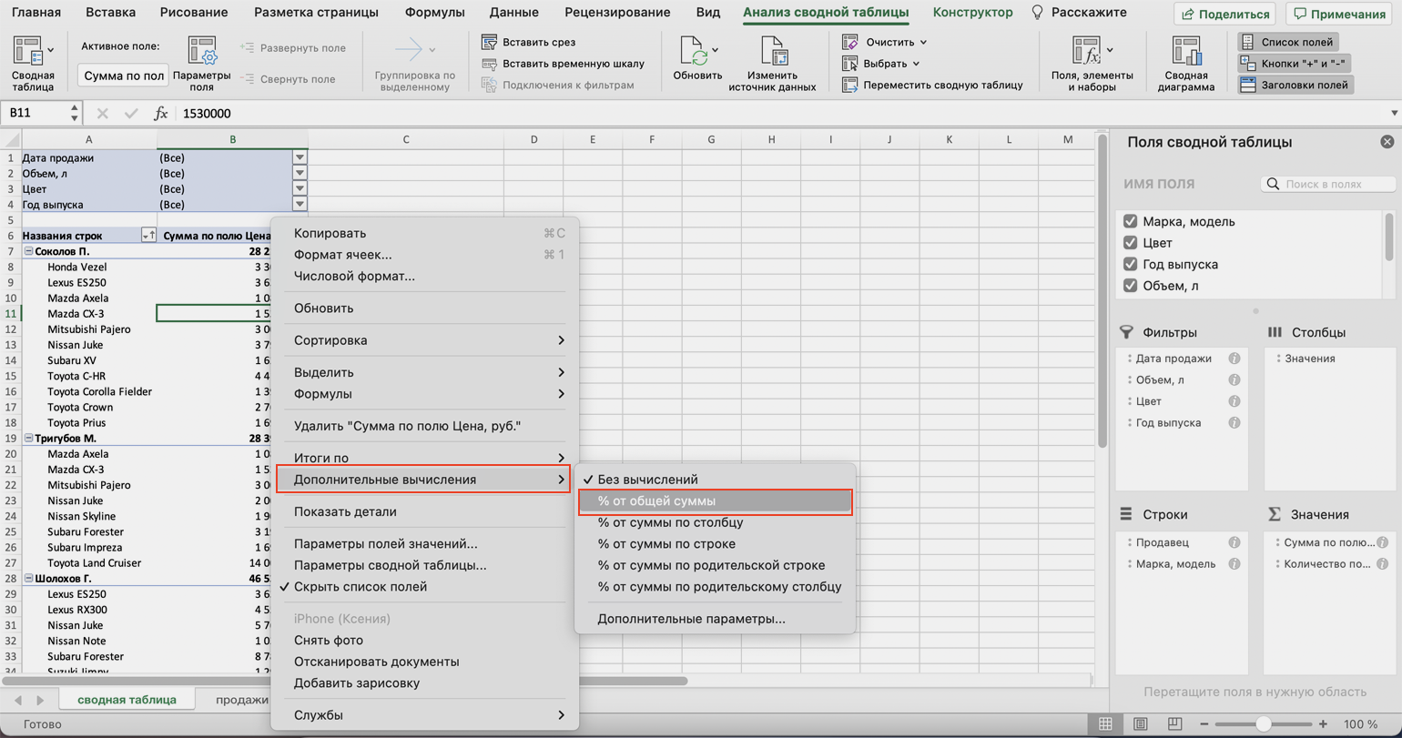 Сейчас в нашей сводной таблице все продажи менеджеров отображаются в рублях. Предположим, нам нужно понять, каков процент продаж каждого продавца в общем объёме. Можно рассчитать это вручную, а можно воспользоваться дополнениями сводных таблиц.
