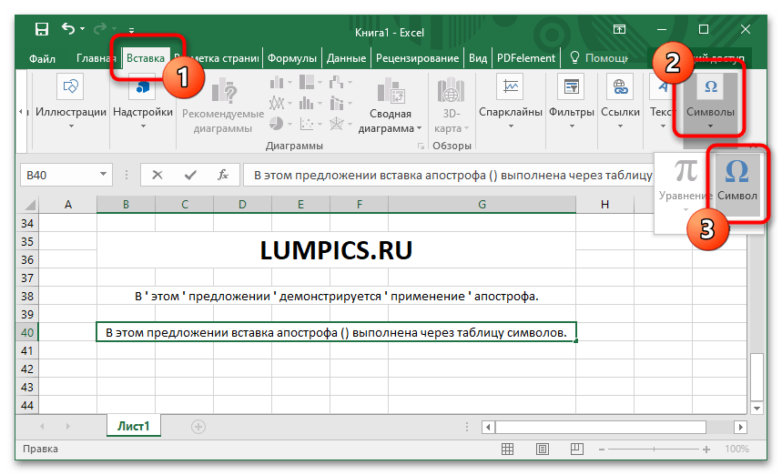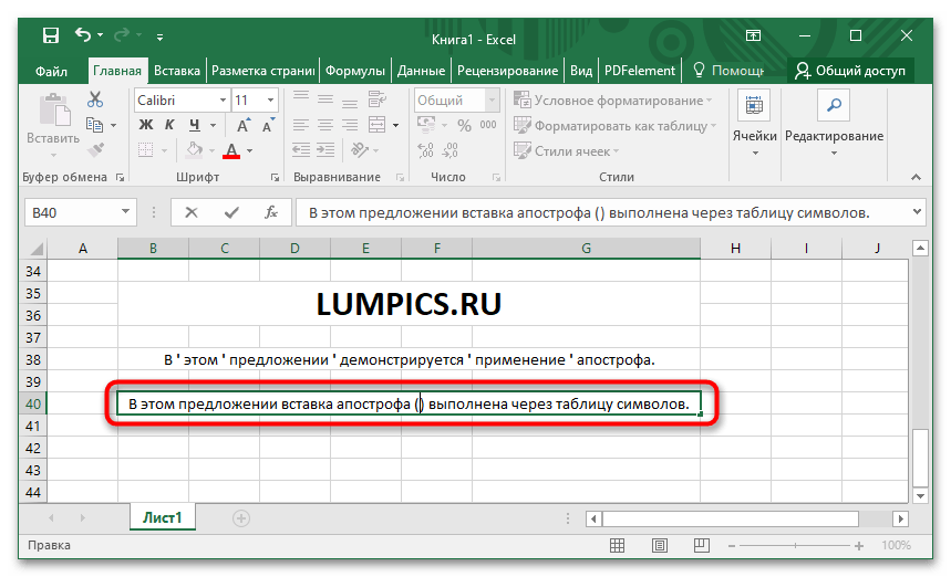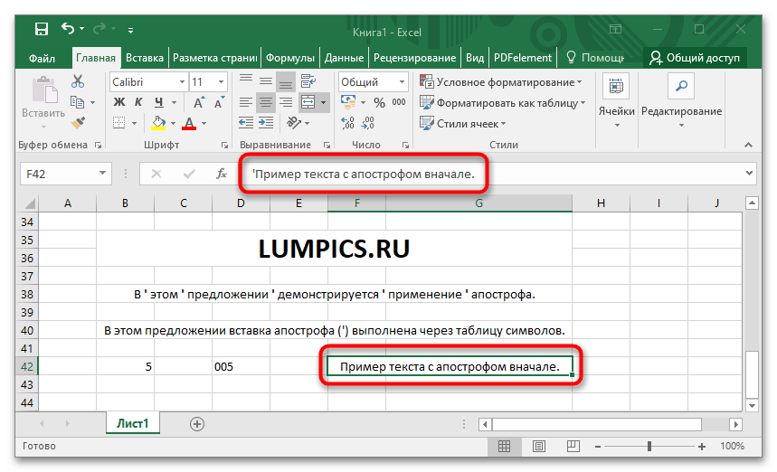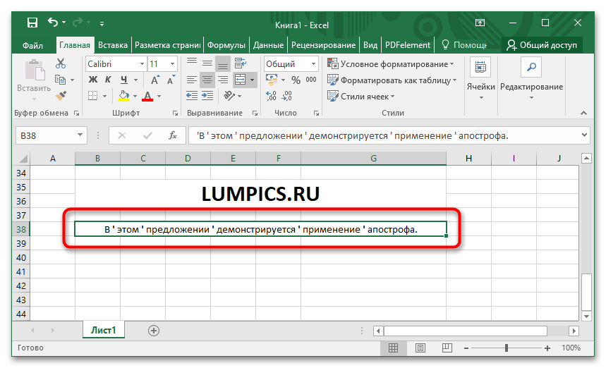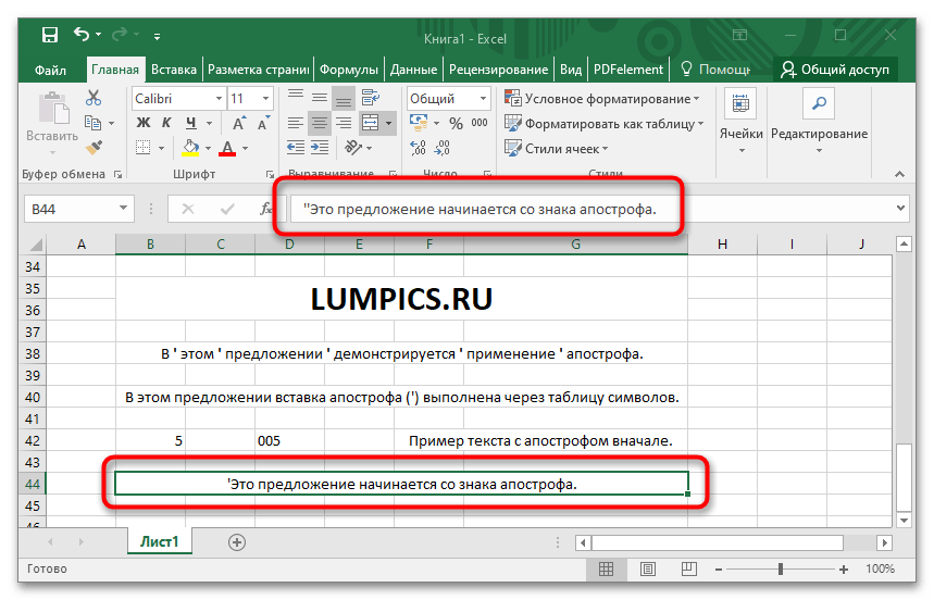 Проблемы появляются, когда нужно начать печать текста в ячейке со знака апострофа — он попросту исчезнет после нажатия клавиши Enter, хотя в строке формул символ будет отображаться.