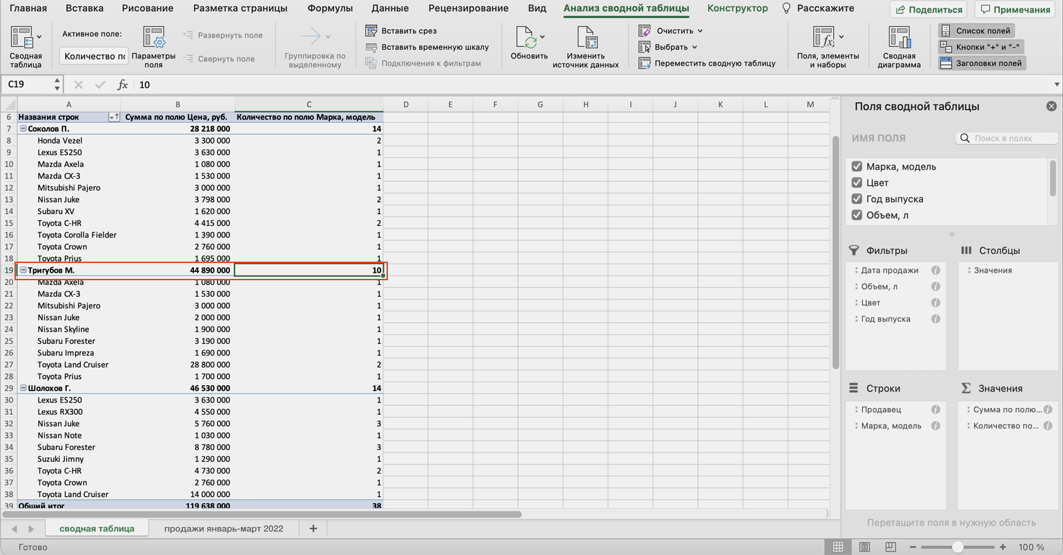 Можно свернуть подробности с перечнями автомобилей, кликнув на знак – слева от фамилии менеджера. Тогда таблица станет короче, а данные, за которыми мы шли, — кто из менеджеров поработал лучше в этом квартале, — будут сразу перед глазами.