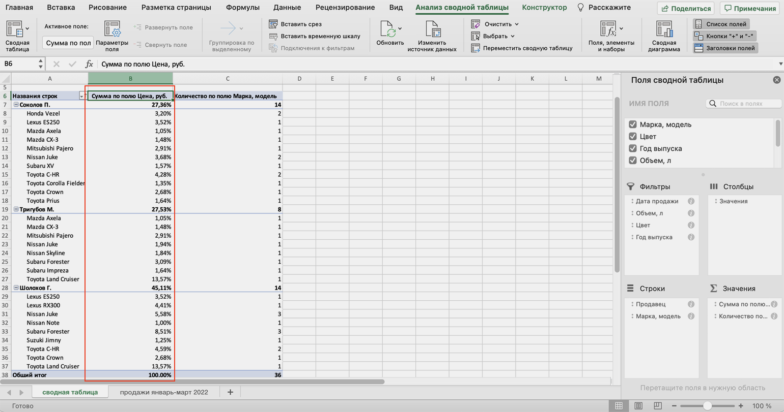 Теперь вместо цен автомобилей в рублях отображаются проценты: какой процент каждый проданный автомобиль составил от общей суммы продаж всего автосалона за квартал. Проценты напротив фамилий менеджеров — их общий процент продаж в этом квартале.