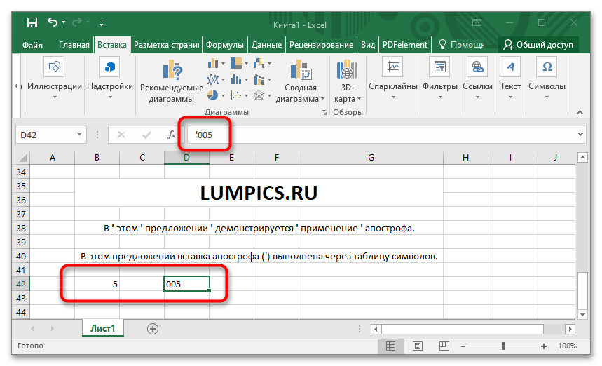 При необходимости поставить апостроф в начале ячейки возникают проблемы, так как табличный процессор воспринимает этот знак как специальный и не отображает после ввода. Такой символ используется для ручного форматирования вводимой информации в текст. То есть при необходимости вписать число «005» в программе будет отображаться только одна цифра «5», потому что это целочисленное значение. Но если перед вводом поставить знак апострофа, произойдет форматирование в строковое значение.