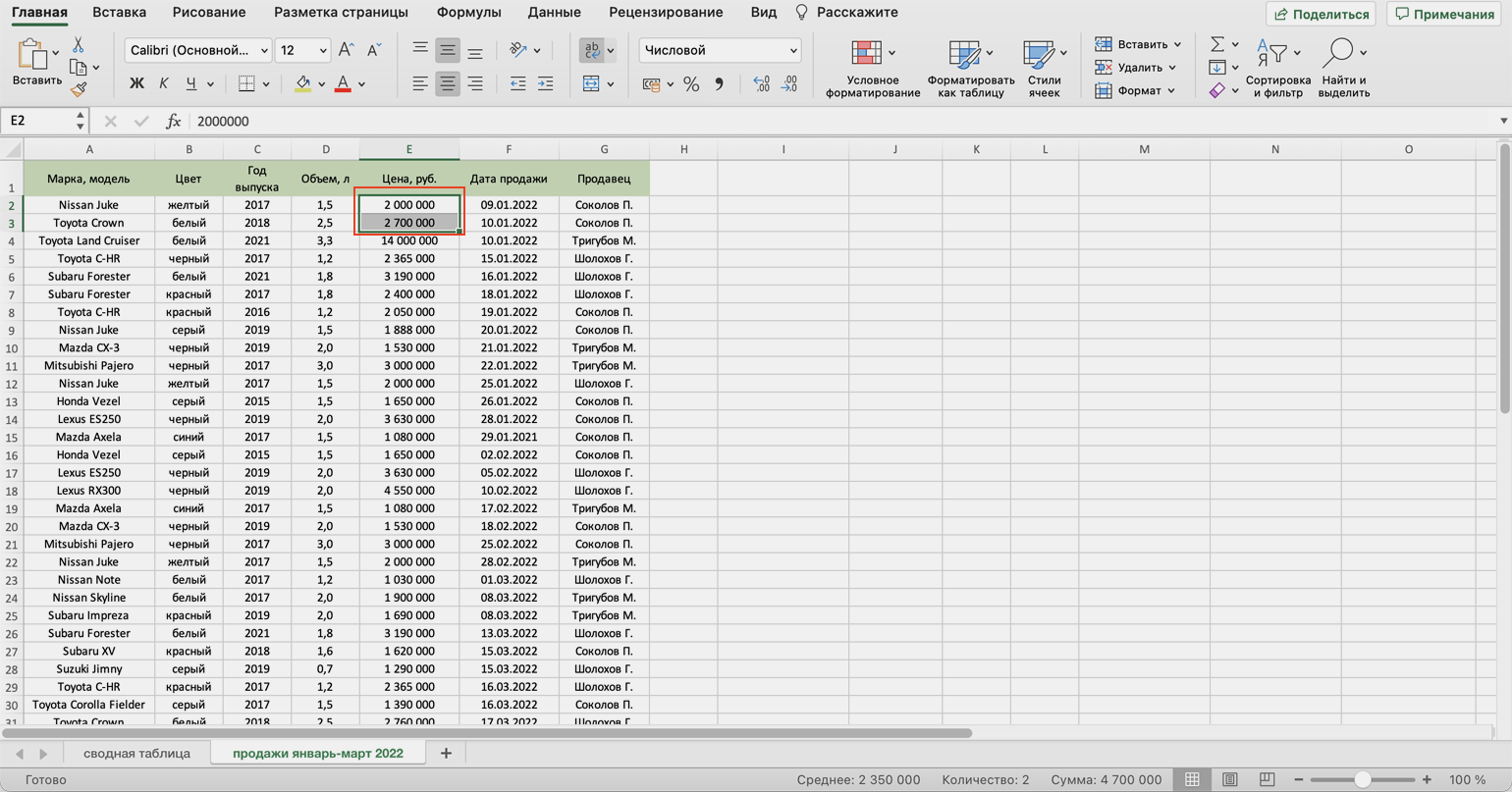 Например, поменяем цены двух автомобилей в таблице с продажами.