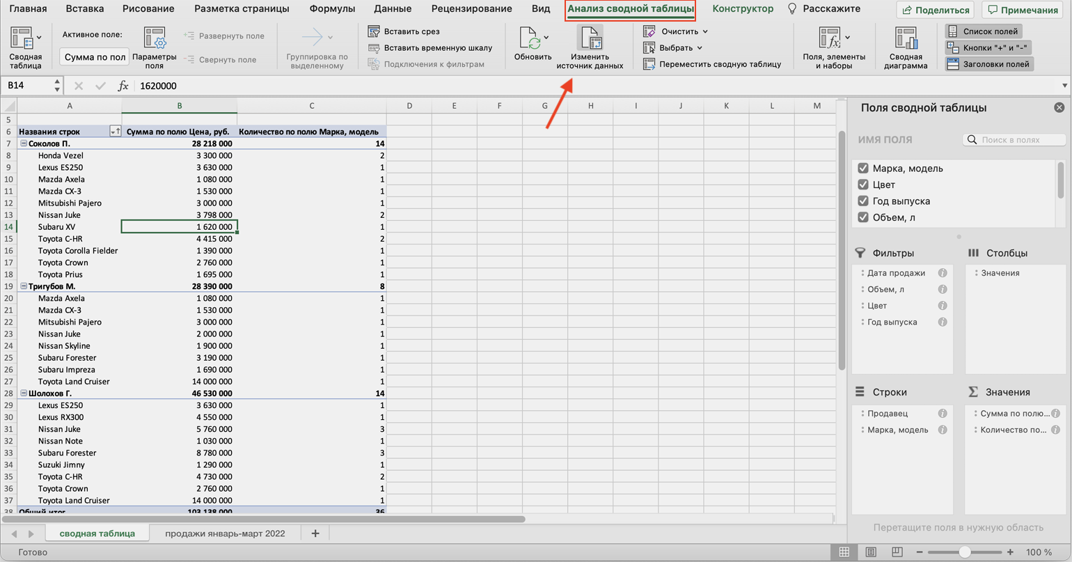 Чтобы данные сводной таблицы тоже обновились, переходим на её лист и во вкладке «Анализ сводной таблицы» нажимаем кнопку «Обновить».