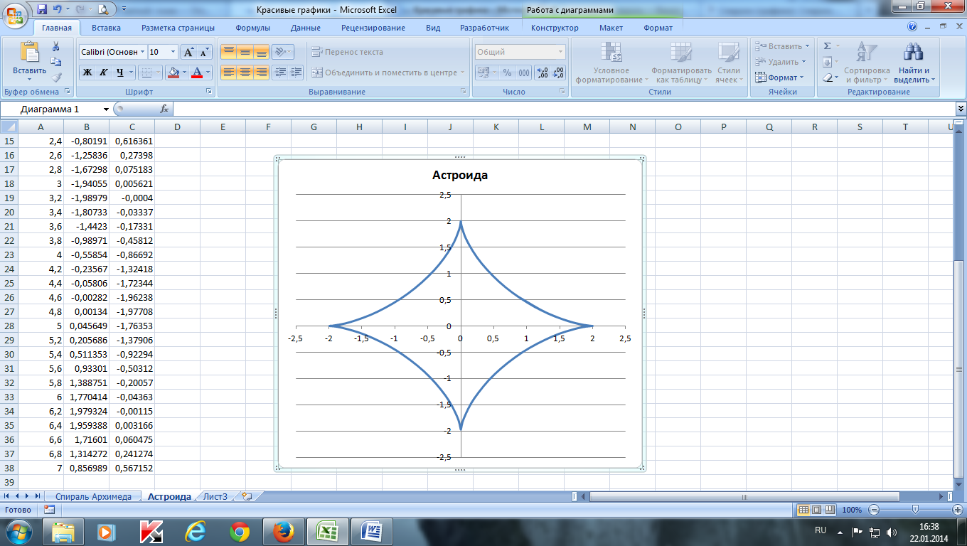 Построить астроиду по следующим данным:— в столбце А – значения угла t в радианах от до 7 с шагом 0,2— в столбце В – значения х = 2*(cos (t)) 3 — в столбце С – значения y = 2*(sin (t)) 3 — выделить значения в столбцах B и С и построить диаграмму (тип: точечная с гладкими кривыми)