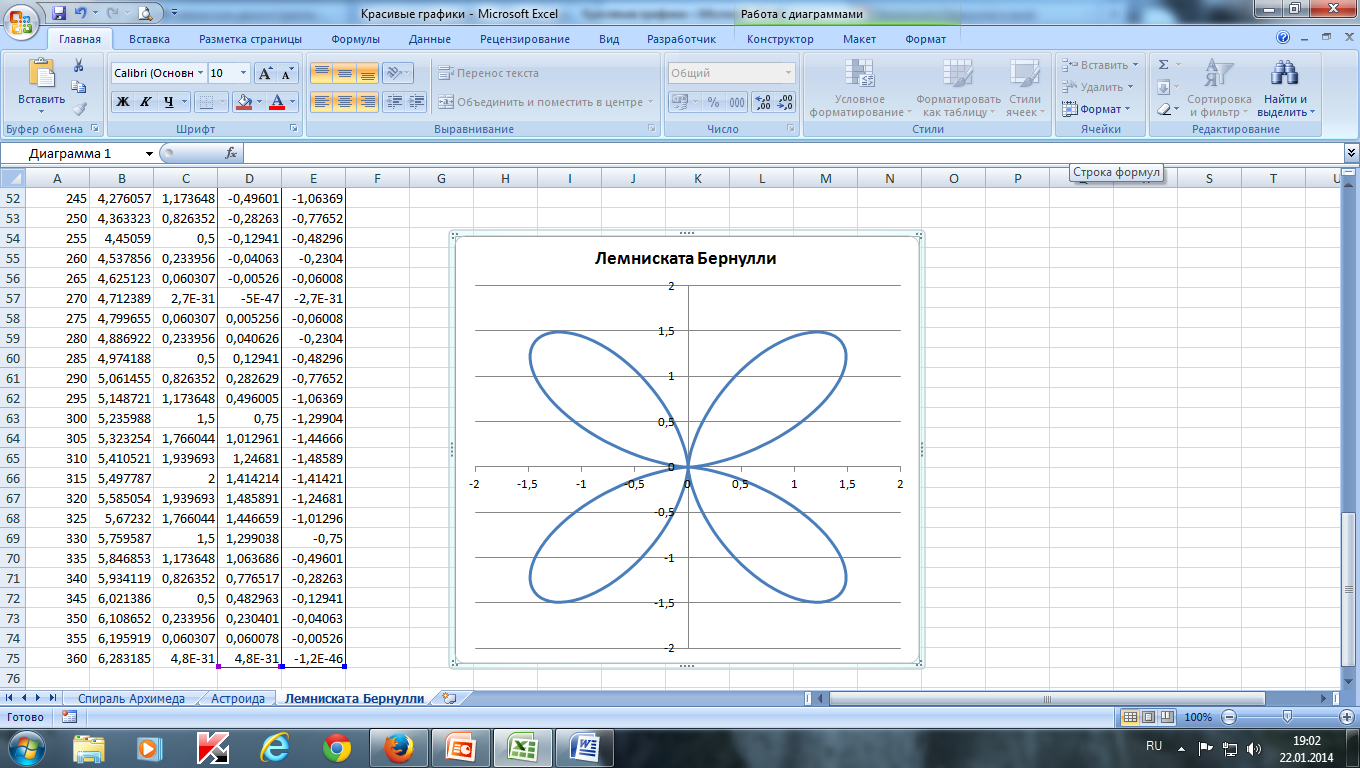 Построить лемнискату Бернулли по следующим данным:— в столбце А – значения a от до 360 с шагом 10 (угол в градусах)— в столбце В – значения t = a*π/180 (угол в радианах)— в столбце С – значения r = 2*sin(2*t) 2 — в столбце D – значения x = r*cos(t)— в столбце E – значения y = r*sin(t)— выделить значения в столбцах D и E и построить диаграмму (тип: точечная с гладкими кривыми)