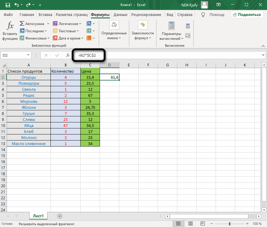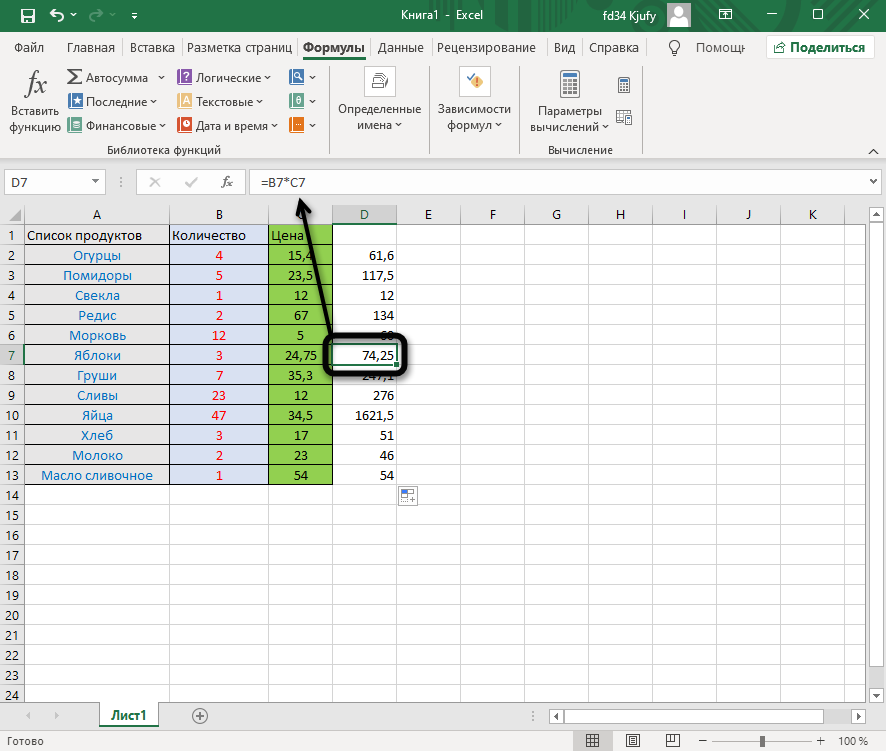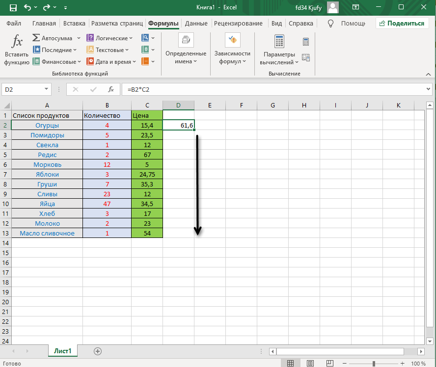 Теперь формула будет скопирована в выбранную ячейку в другом столбце.