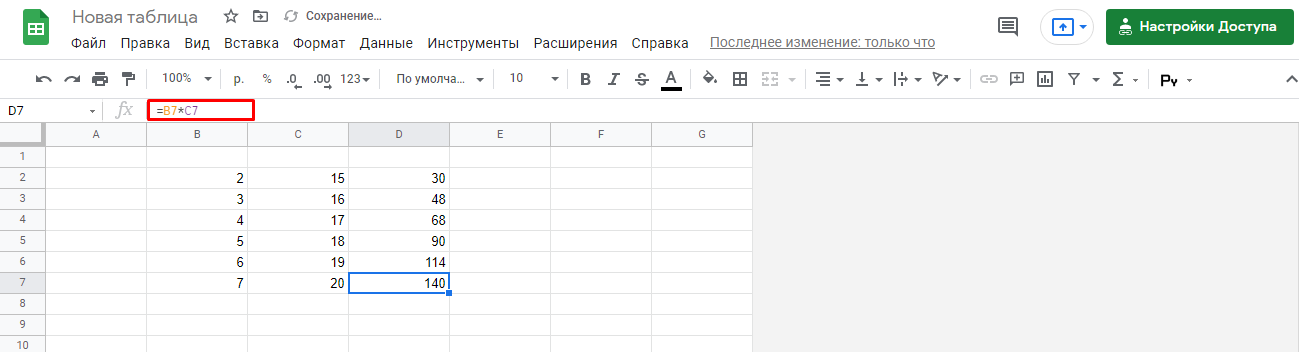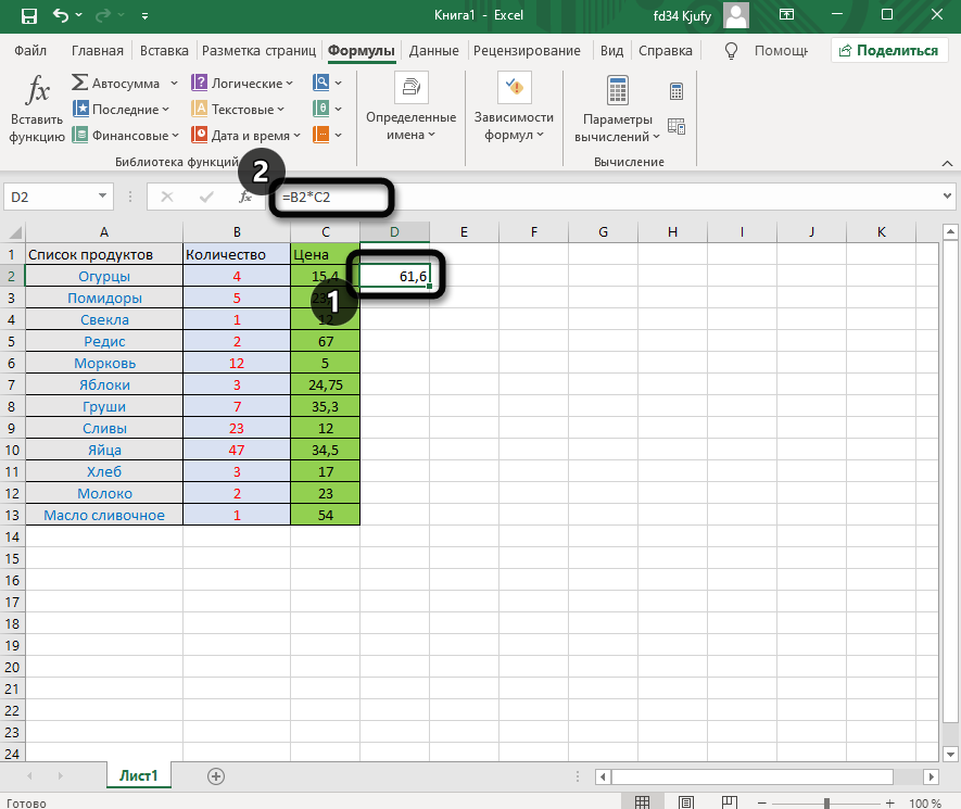 Выделите любую пустую ячейку и напишите в ней знак «=», объявив тем самым функцию. В качестве значения можете взять любое число, написать номер ячейки (используя буквенные и цифровые значения слева и сверху) либо выделить ее левой кнопкой мыши. На следующем скриншоте вы видите простой пример =B2*C2, то есть результатом функции будет перемножение указанных ячеек друг на друга.