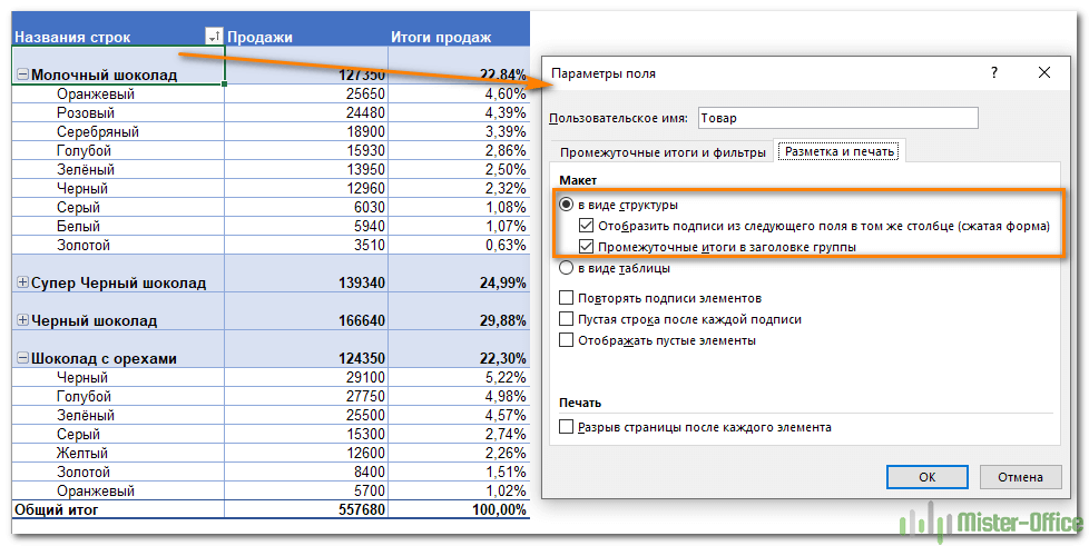 Чтобы настроить макет определенного поля, щелкните на нем, затем нажмите кнопку «Параметры» на вкладке «Анализ» в Excel 2016 и 2013 (вкладка « Параметры» в 2010 и 2007). Также вы можете щелкнуть правой кнопкой мыши поле и выбрать «Параметры … » в контекстном меню.